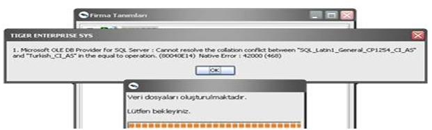 (Cannot resolve the collation conflict between “SQL_latin1_General_CP1254_CI_AS” and “Turkish_CI_AS” in the equal to operation) hatası, güncellenmek istenen firmaya ait tablolar (LG_XXX_XX_….)  ile firma bağımsız tablaların (L_….)  collation namelerinin farklı olmasından ya da farklı firma veritabanı kullanımı olduğu durumlarda ana veritabanı tabloları ile firma veritabanı tablolarının collation name’ lerinin farklı olduğu durumlarda karşılaşılmaktadır.
