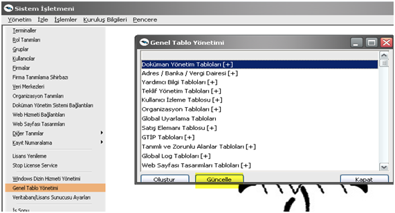 Aşağıdaki ekran görüntüsünde olduğu gibi Sistem İşletmenine giriş yaparak Yönetim \ Genel Tablo Yönetimi altındaki seçeneklerin hepsi için güncelleme yapılmalıdır.
