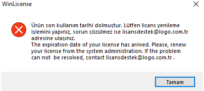 Logo uygulamalarının çalıştırıldığı bilgisayarın tarihinin ileri veya geri alınarak değiştirilmesi durumunda “The Expiration Date of Your License Has Arrived” mesajı ile karşılaşılabilir.