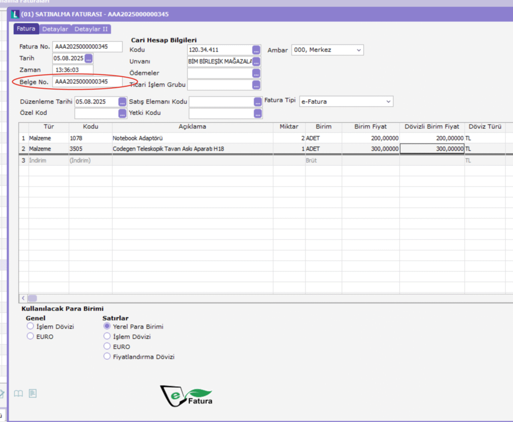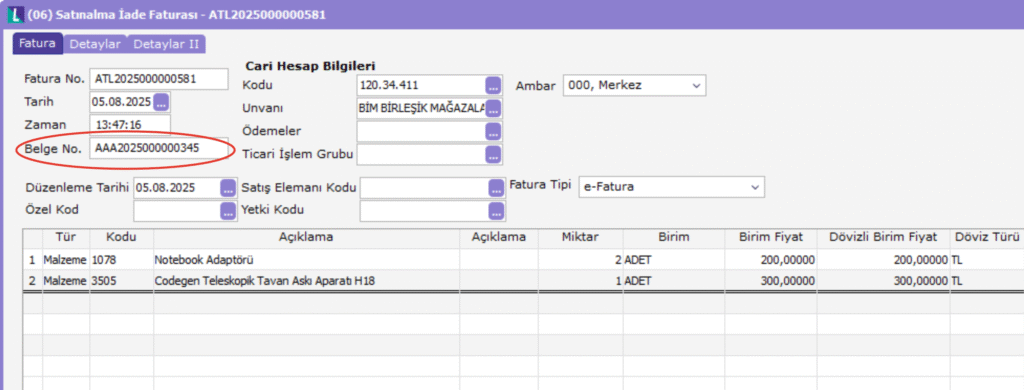 Örnek: Fatura no AAA202500000345 olan bir alım faturasında belge numarası da aynı olmalıdır. (İade faturası oluştururken, sistem BELGE NO alanında yazan bilgiyi referans olarak kullanır. Bu sebeple fatura no alanında yazan bilginin bir önemi yoktur. İade faturasında esas olan alan BELGE NO alanıdır.)