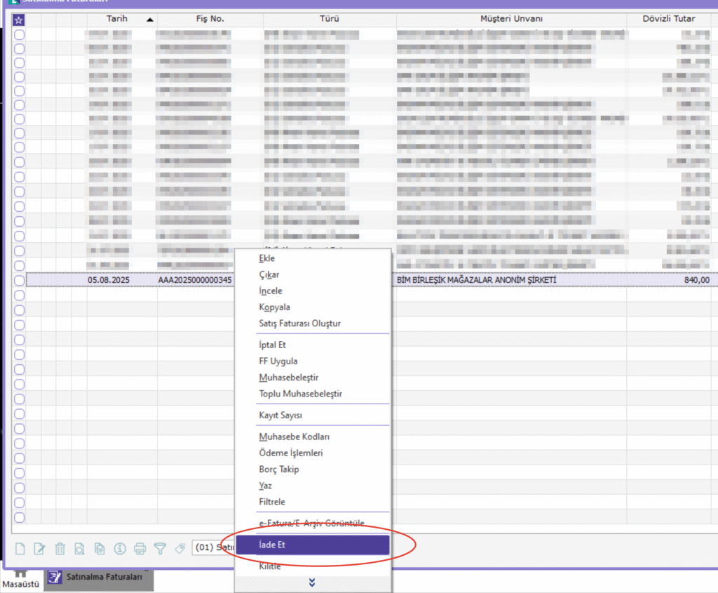 “Satınalma Faturaları” listesinde ilgili faturanın üzerine gelip sağ tıkladığınızda, açılan menüde “İade Et” seçeneğini seçin.
